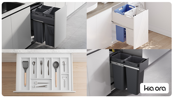 Exclusively available at Wilson & Bradley, the Kia Ora collection boasts an extensive array of products and accessories. Our offerings include waste bins, laundry baskets, drawer slides, drawer matting, and wardrobe accessories. Each item in this range is crafted with high-quality materials, ensuring durability and longevity. Installation is simple and straightforward, and our designs are tailored to enhance the user experience.