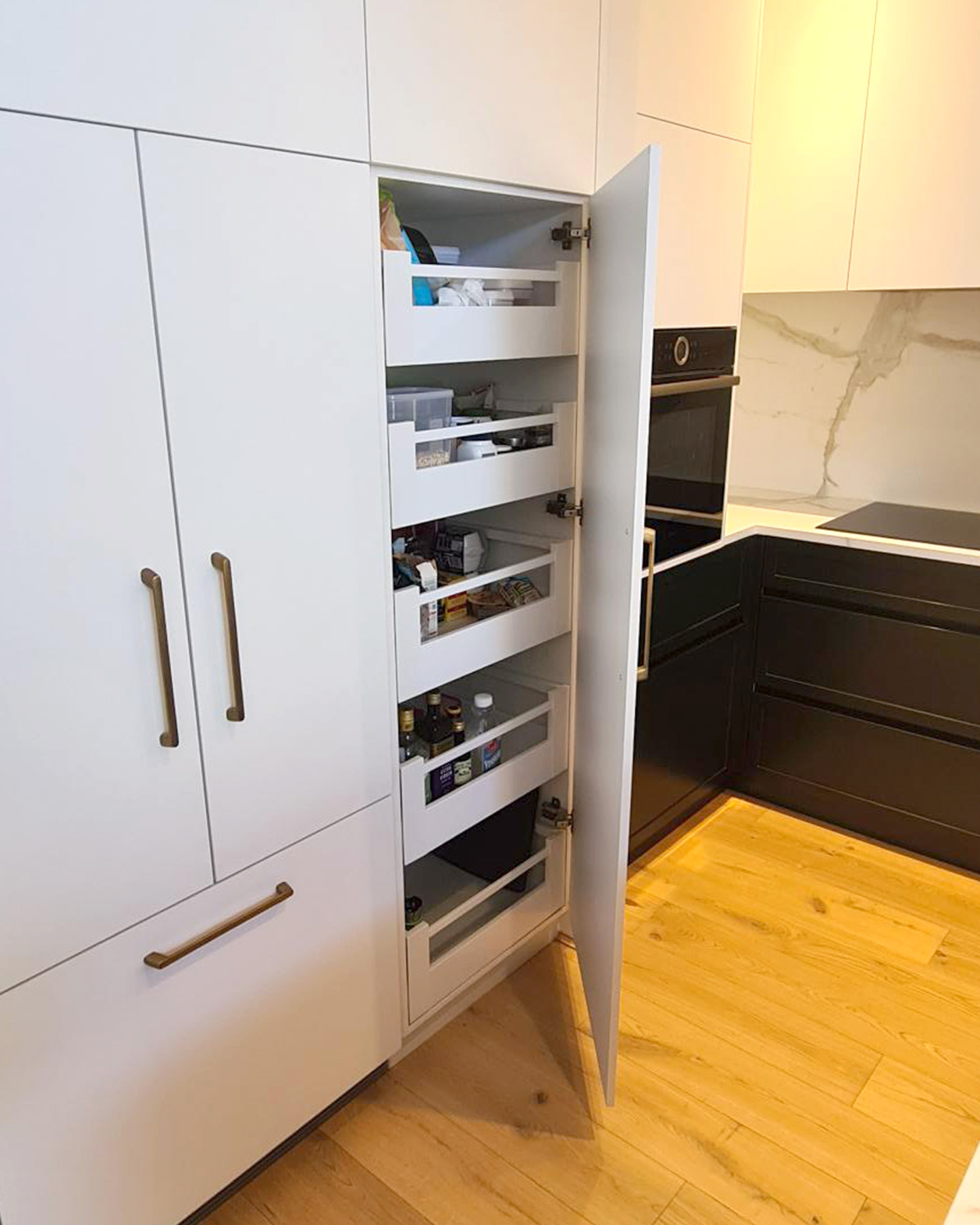 This stylish kitchen by @refinedcabinetsperth is full of handy storage solutions. Featuring Blum hardware throughout for a quality look and effortless usability.