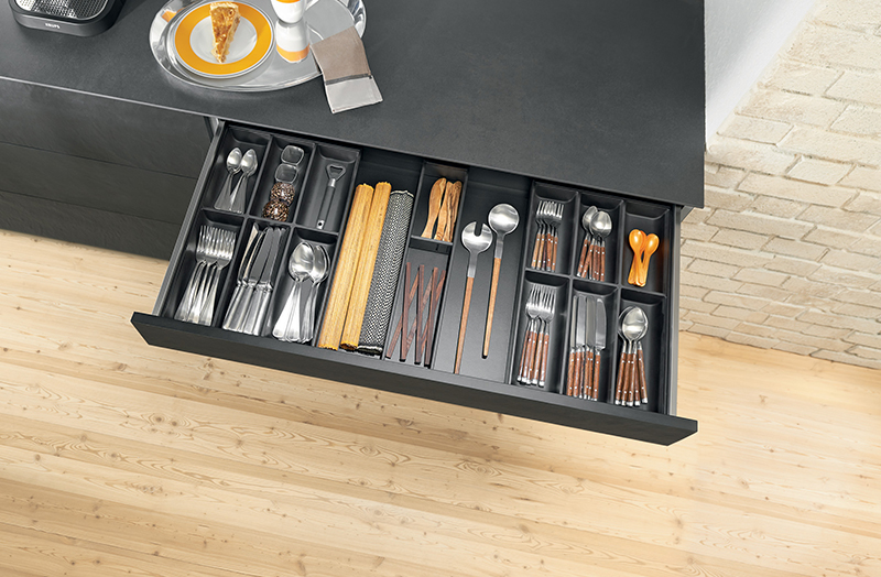 4. Plan internal organisation: Keep your drawers clean and tidy with the AMBIA-LINE inner dividing system. Add cutlery trays, utensils dividers or plate holders to keep everything organised and in place.