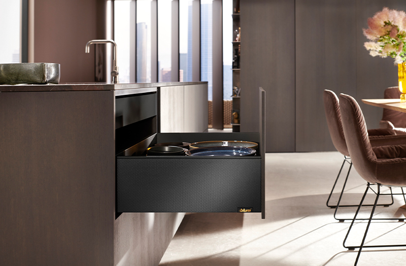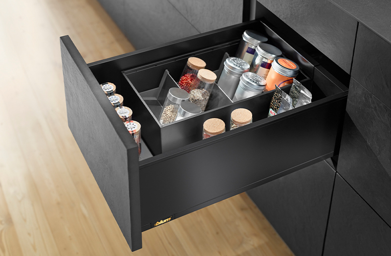 - AMBIA-LINE integration: Complementing the Blum's LEGRABOX box system, the AMBIA-LINE inner dividing system features a range of frames, inserts and accessories designed to organise LEGRABOX interiors.