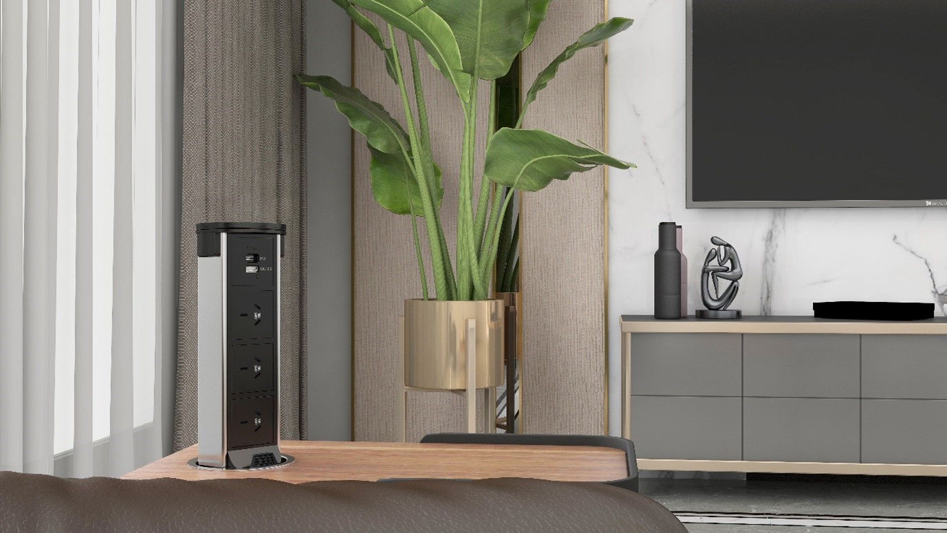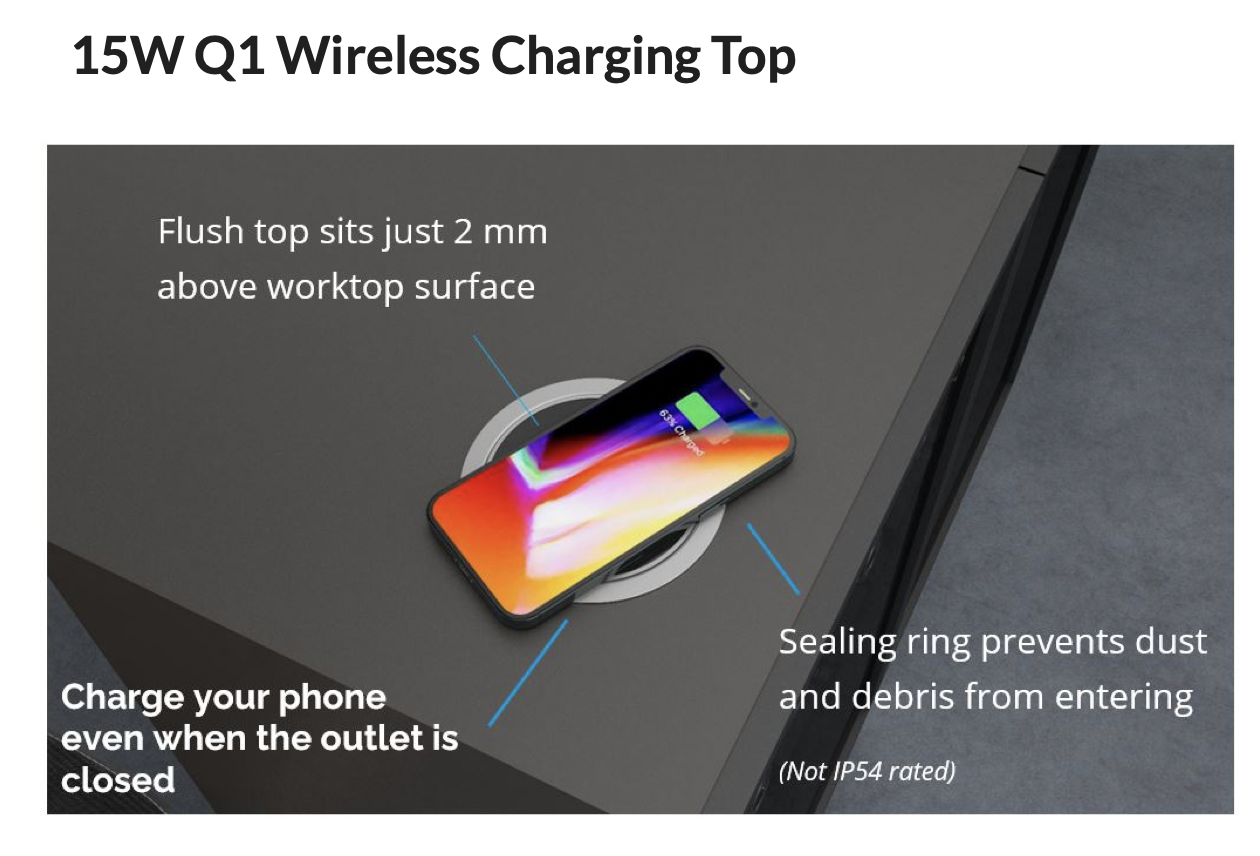 Designed with high quality finishes and materials and a sealing ring to prevent dust and debris from entering, Docking Drawer Flush Pop Up outlets offer you the ability to safely power with purpose. Choose from configurations including a combination of USB-C (PD), USB-A and AUS Type I outlets, all featuring QI wireless charging capability on top.