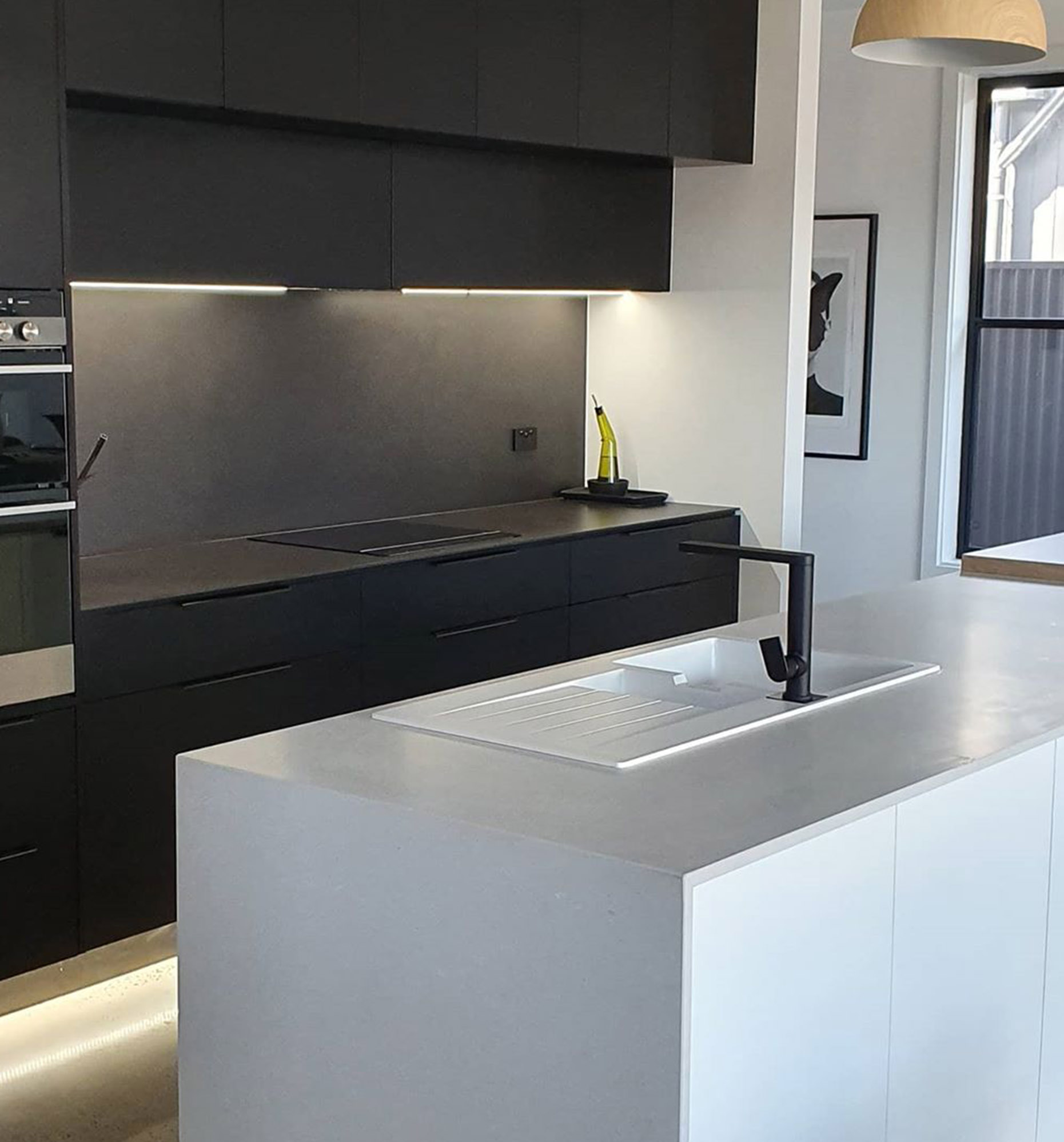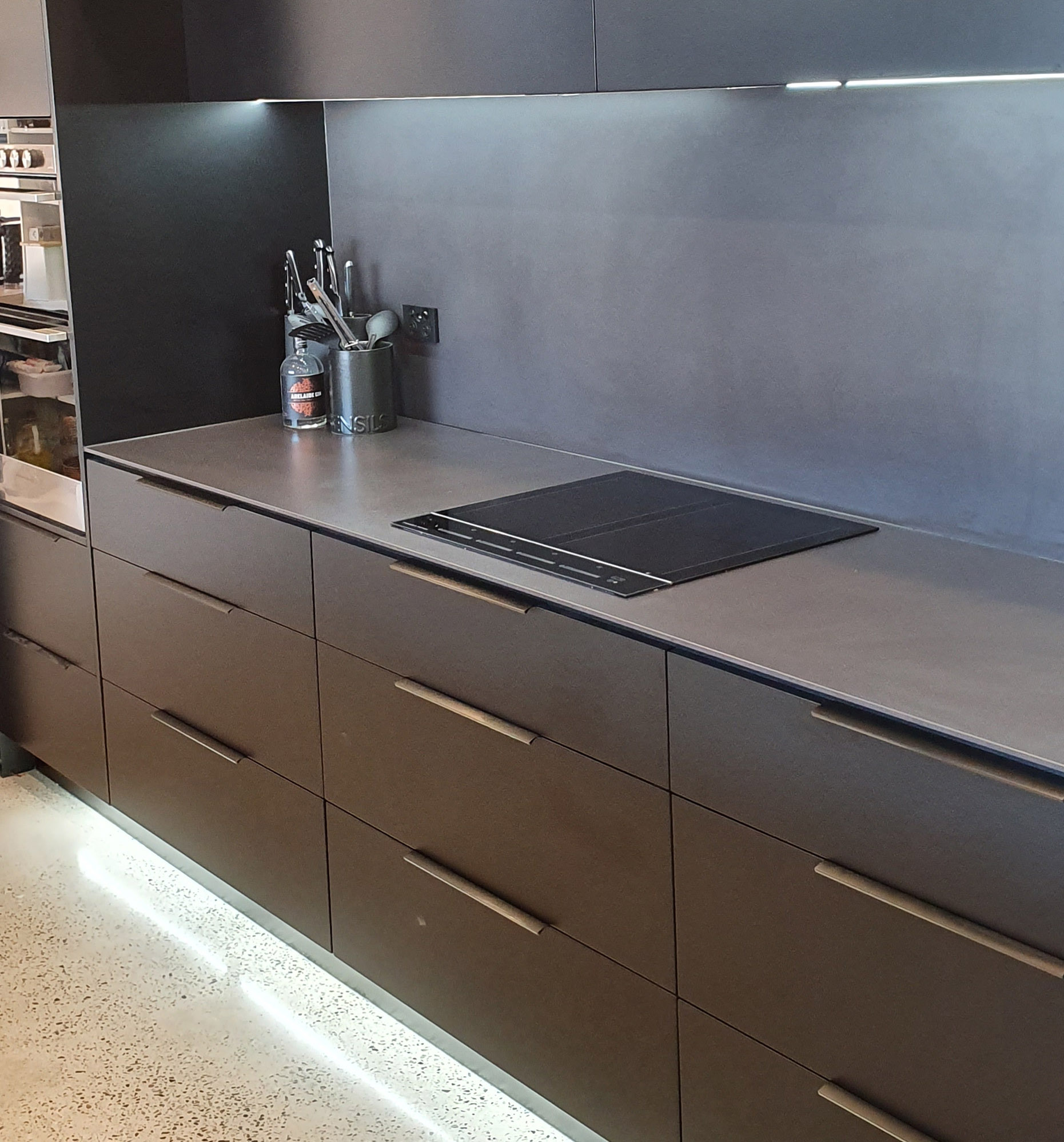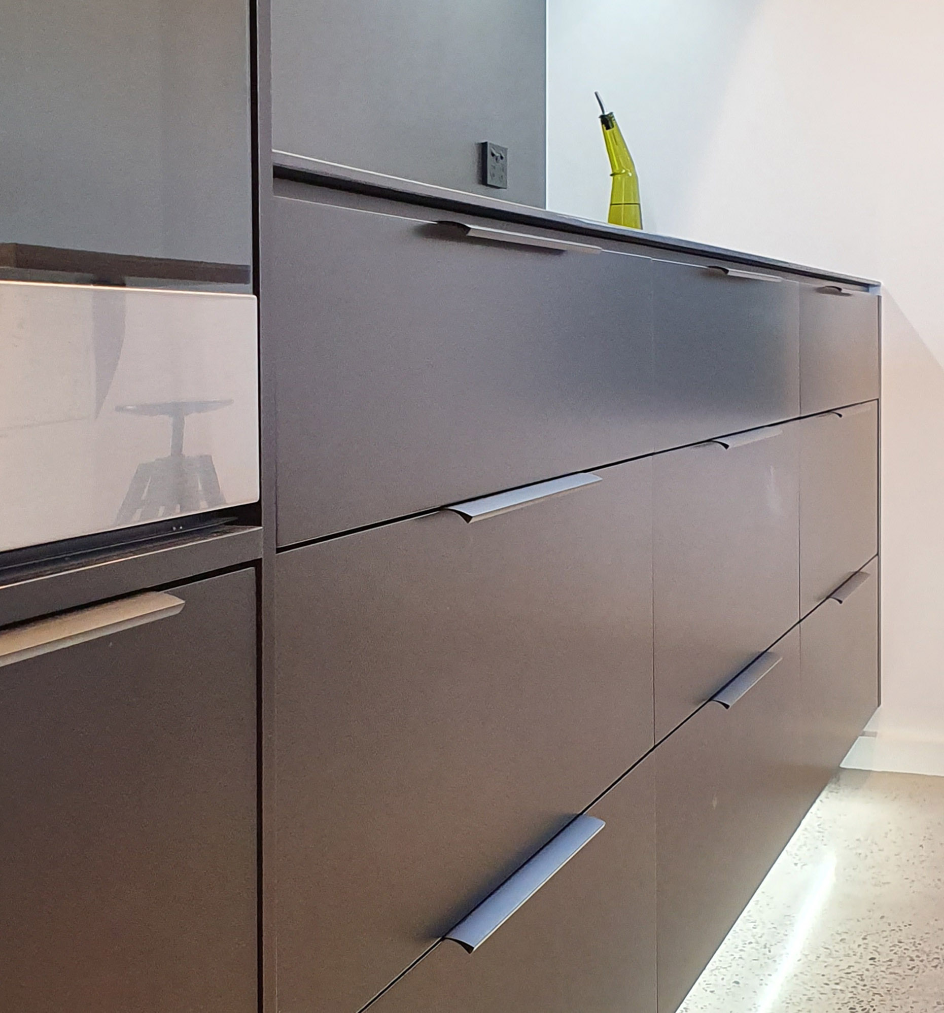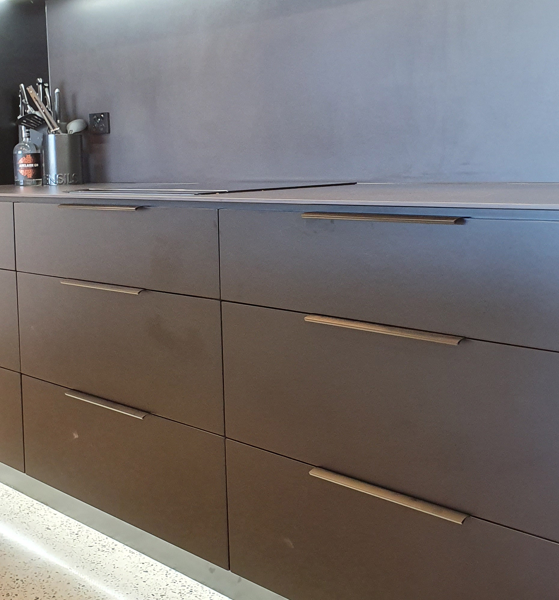 The Furnipart Edge Straight handle in Matte Black matches this kitchen design perfectly for a stylish black on black finish.