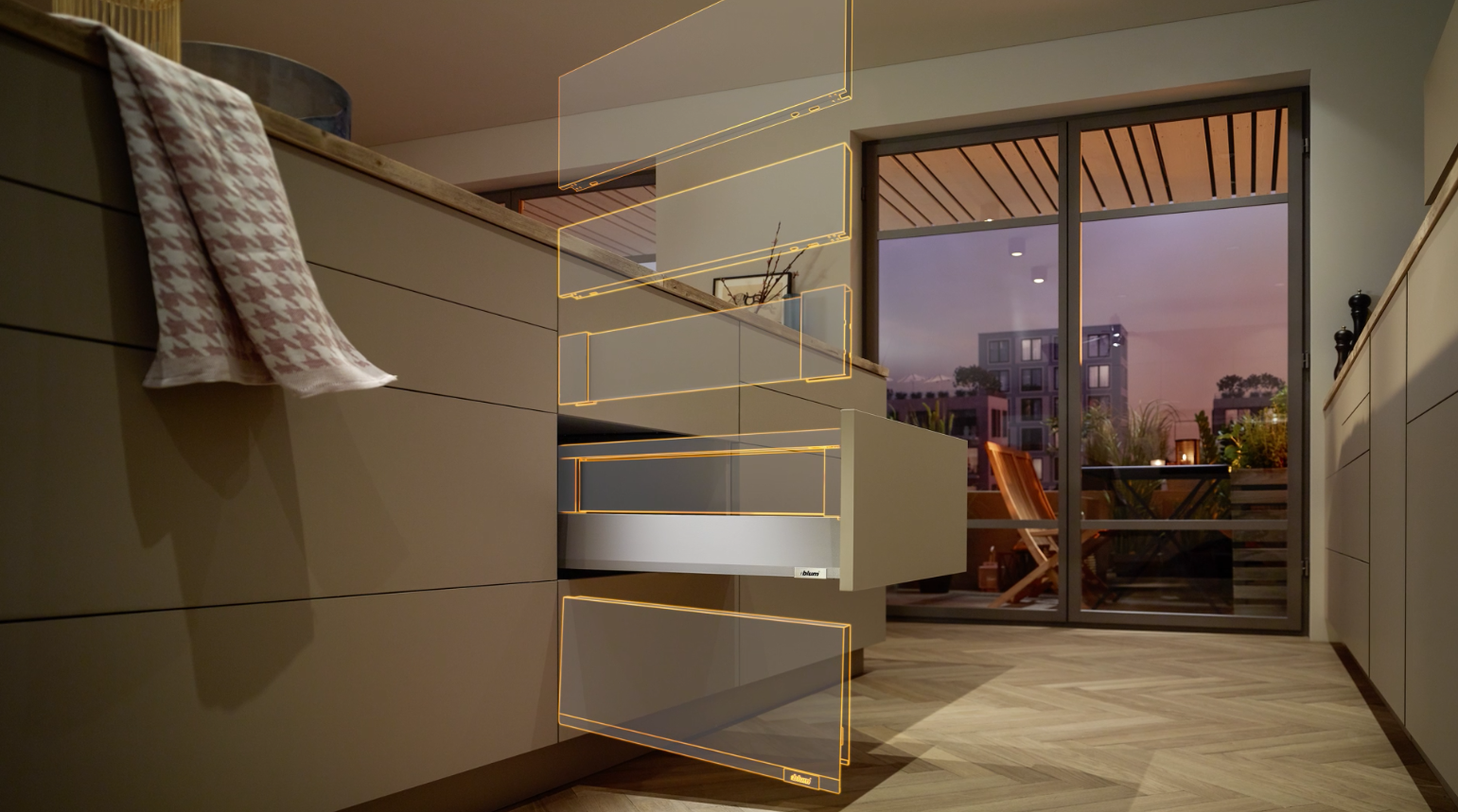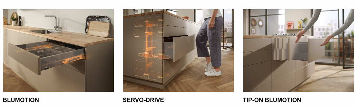 Furniture always closes softly and effortlessly thanks to integrated soft-close BLUMOTION. For handle-less fronts, simply combine MERIVOBOX with the SERVO-DRIVE electrical motion support system or the TIP-ON mechanical opening support system. Thanks to the identical fixing positions, your manufacturing processes are always the same – so the motion technologies can easily be retrofitted.