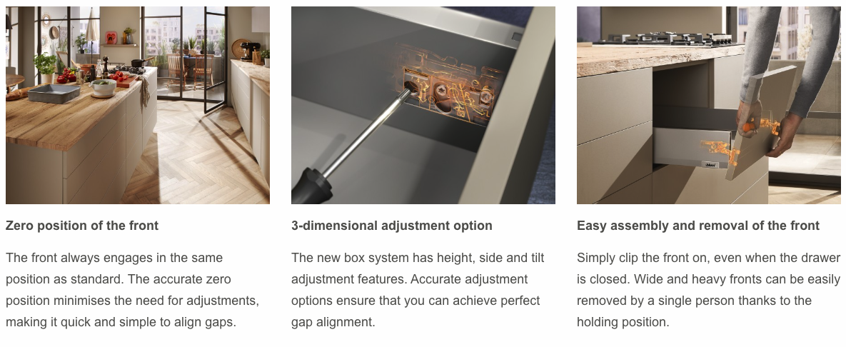 Every MERIVOBOX option can be implemented quickly and easily thanks to the consistent platform concept. The box system has simple, clearly labelled and easily accessible 3-dimensional adjustment features which are the same for every drawer side.