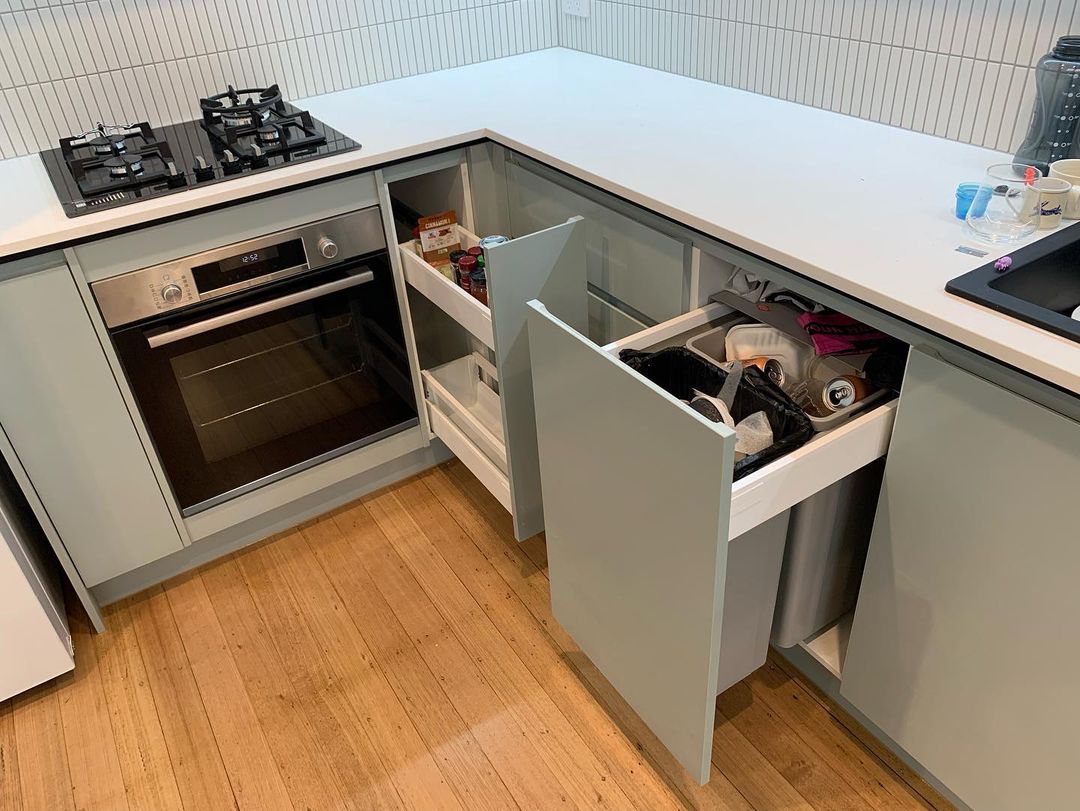 This minimalist kitchen design was completed by @marshallcabinets and features our Wesco bins alongside Blum runners. These make perfect additions to renovations or new designs as they allow for discreet and stylish storage.
