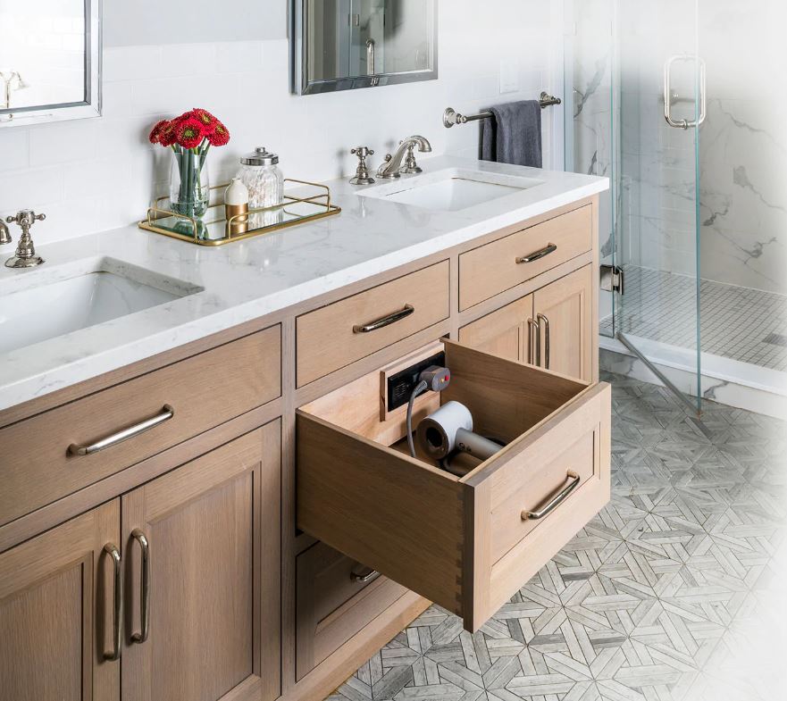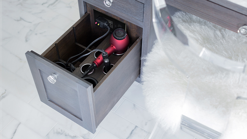 Install Docking Drawer Trio outlets and the new Docking Drawer Steel Canisters into vanity drawers of any type to create a dedicated space to power and stow styling tools & other accessories, keeping countertops clear and devices always plugged in and at the ready.