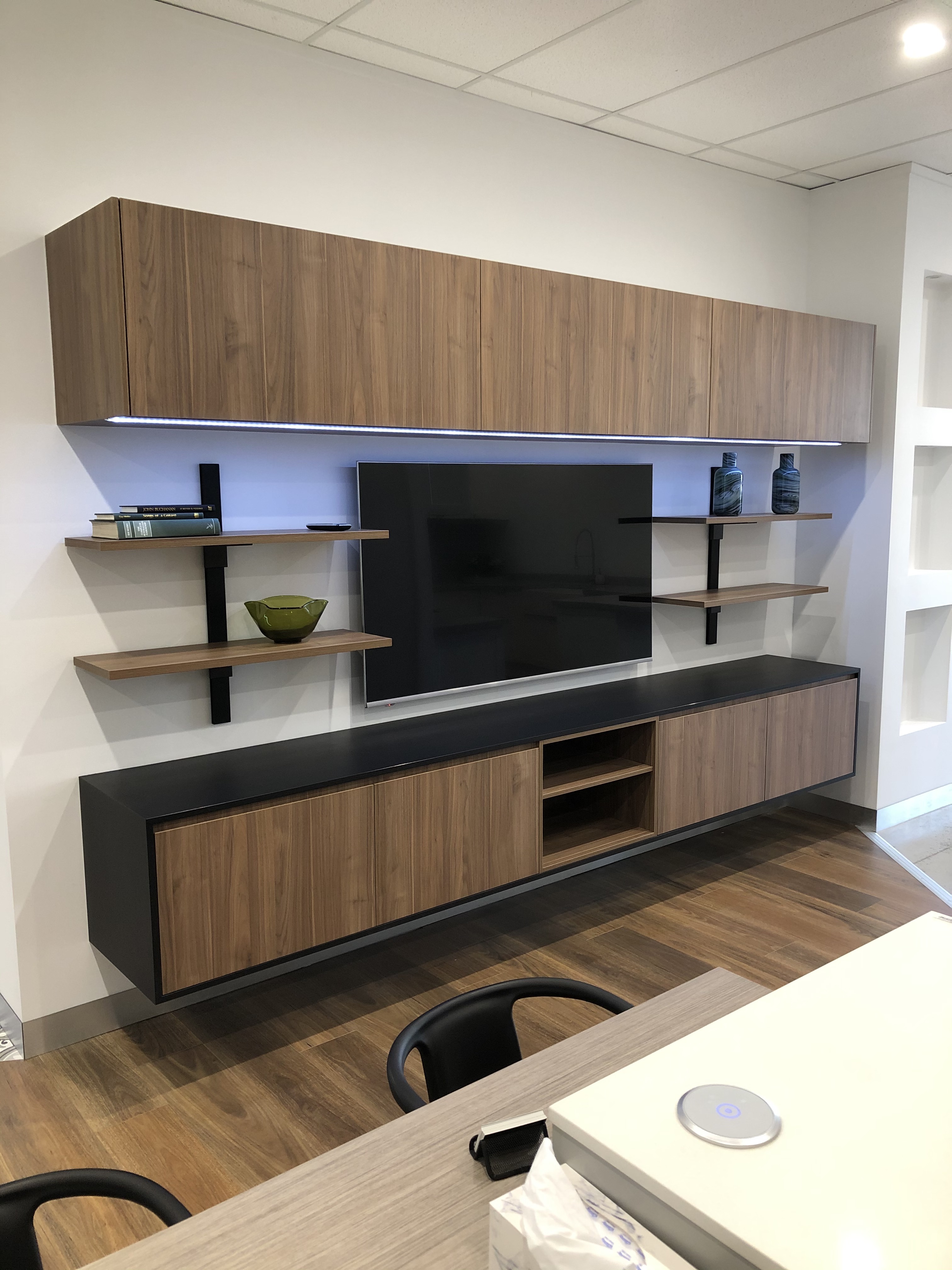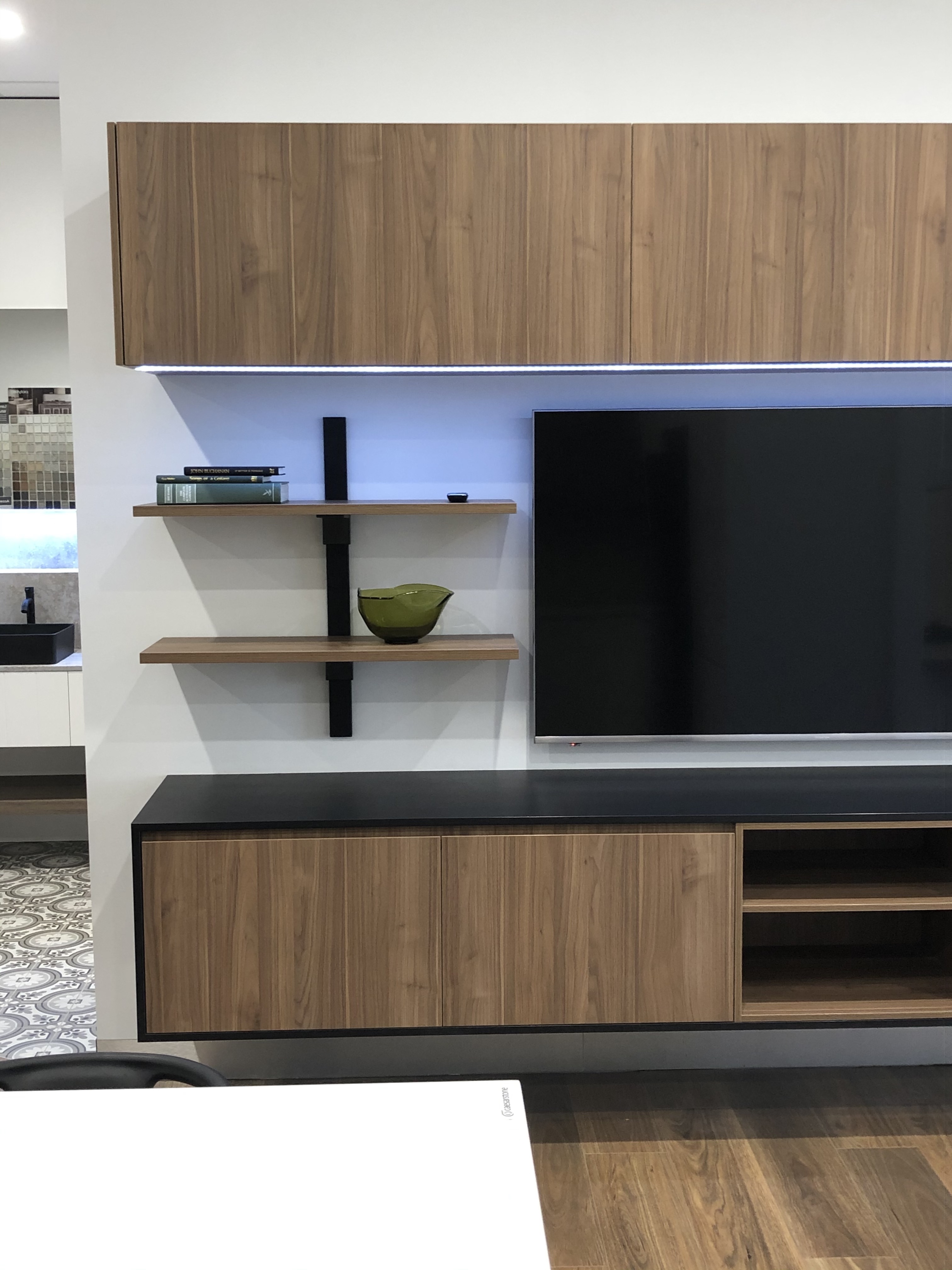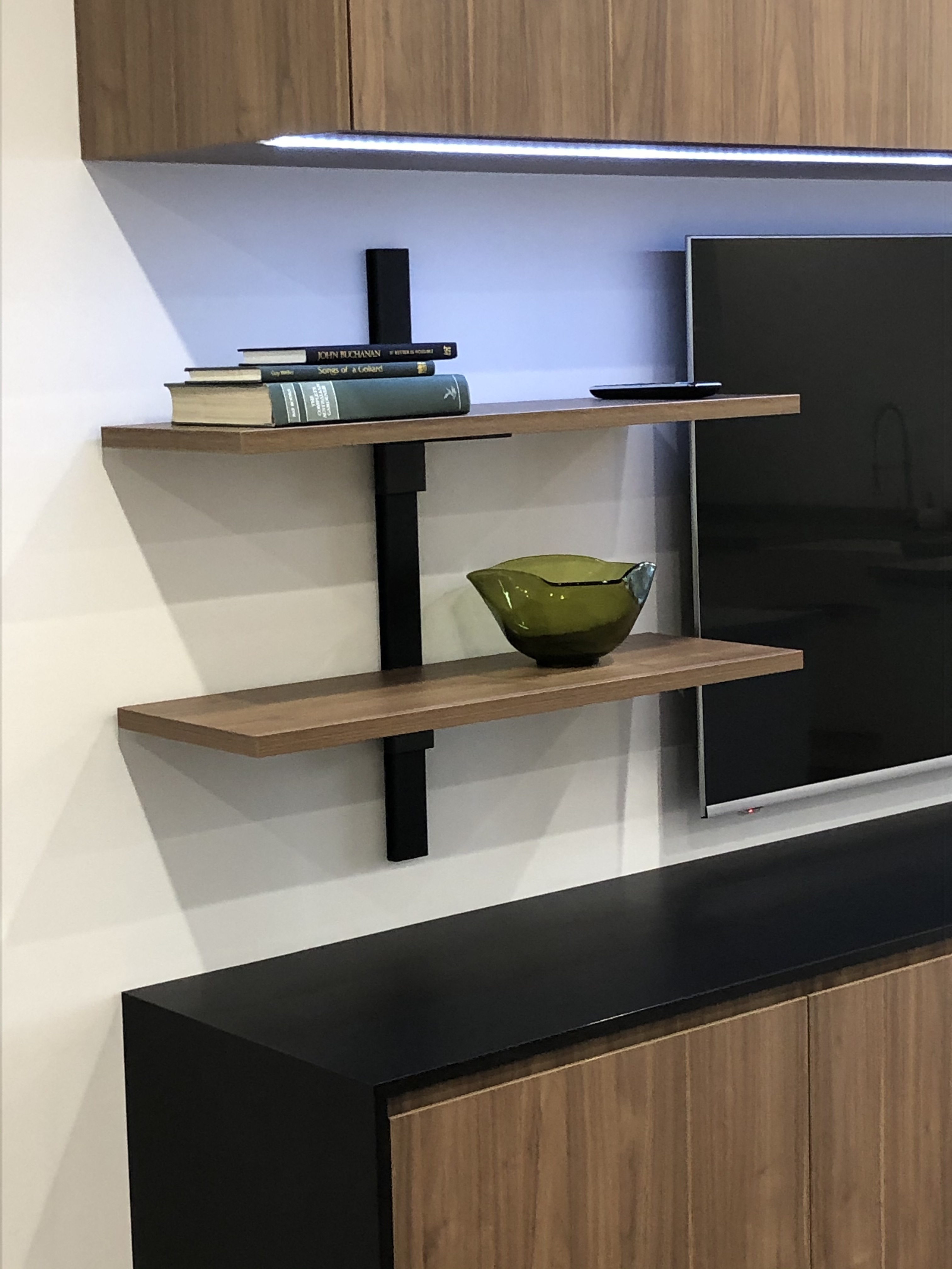 Clean lines and geometric forms are the heroes of this beautiful entertainment unit, which make great use of the Peka Pecasa shelving system. Take a look at QKM Kitchens brand new showroom!