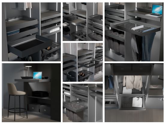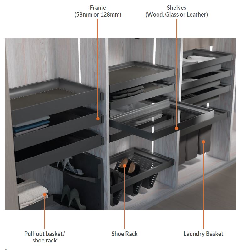 Customisable with a range of accessories including pull-out frames and storage units in two sizes, hook-on elements, shoe, laundry and trouser racks, and pull-out shelves that turn into smart workstations capable of using all available space.