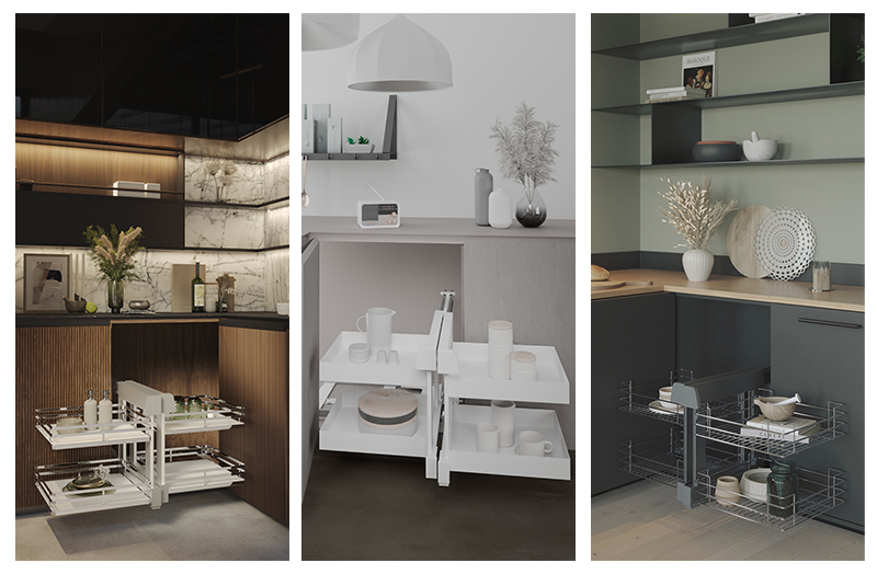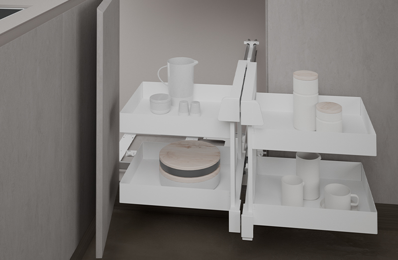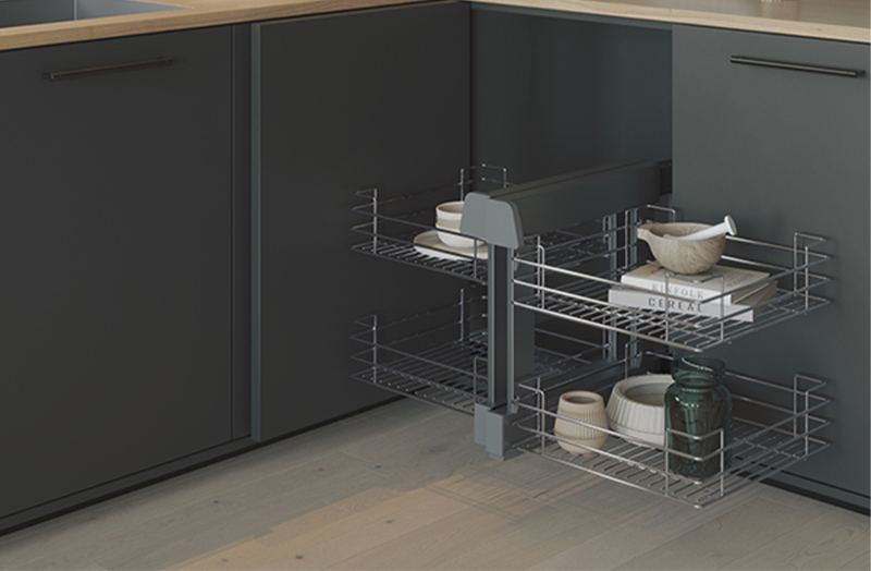 Designed to seamlessly integrate into 900mm carcases, the Spazio corner unit ensures a perfect fit for your cabinetry layout. Say goodbye to wasted corner space and hello to efficient storage solutions that elevate both form and function in your kitchen.