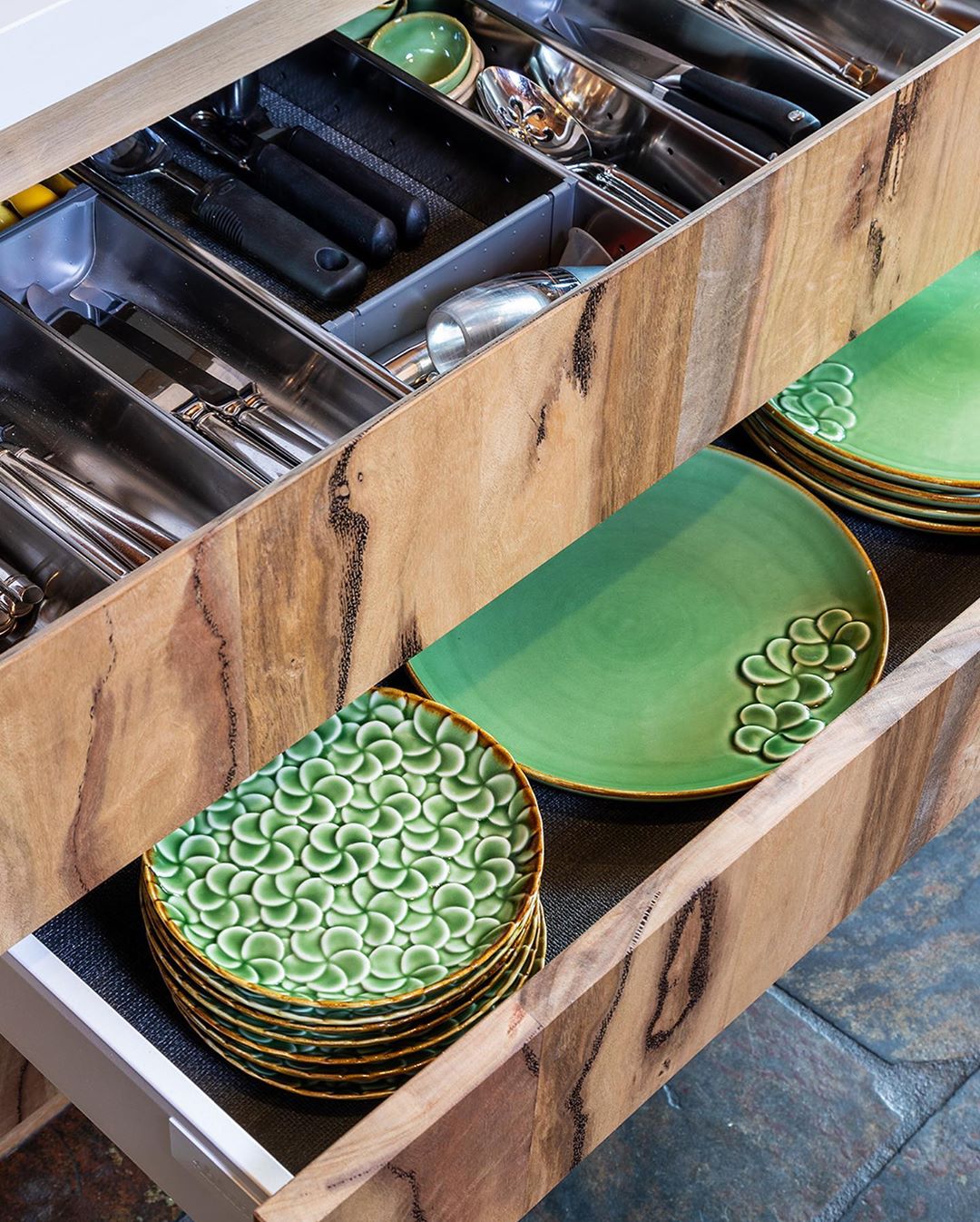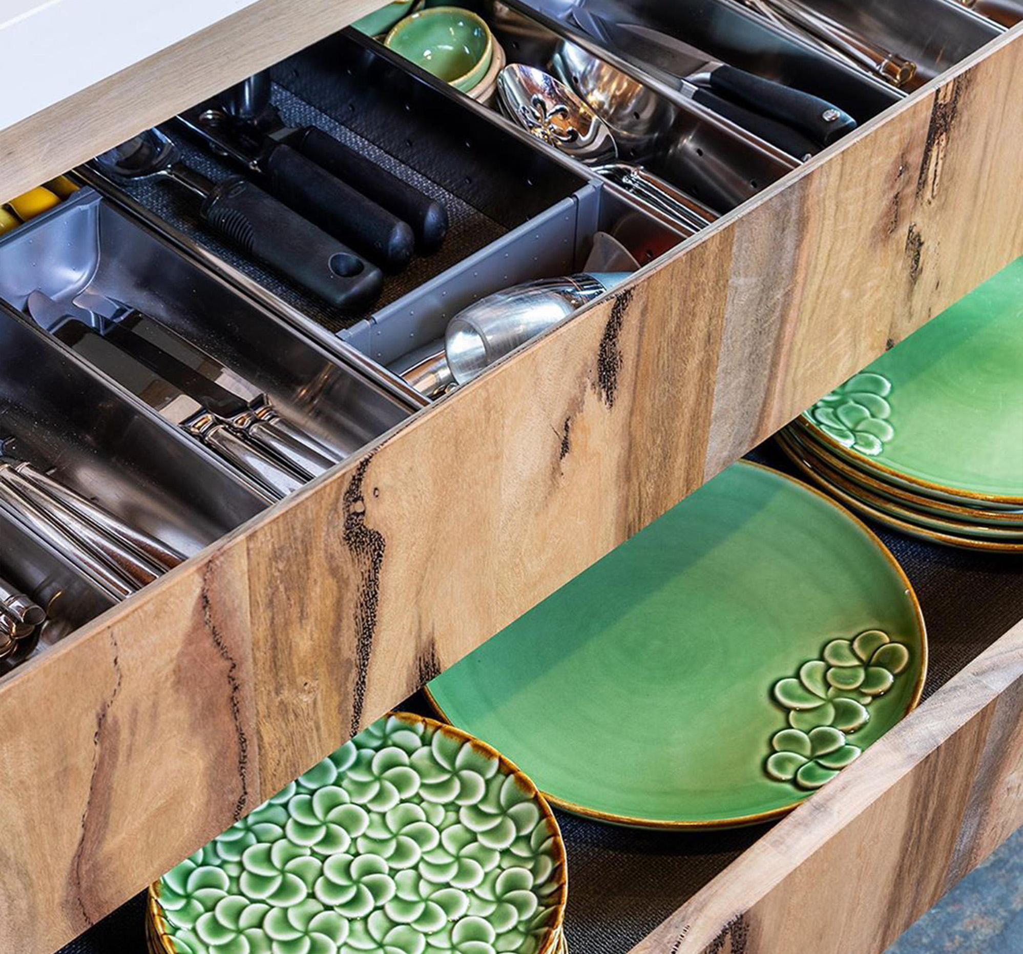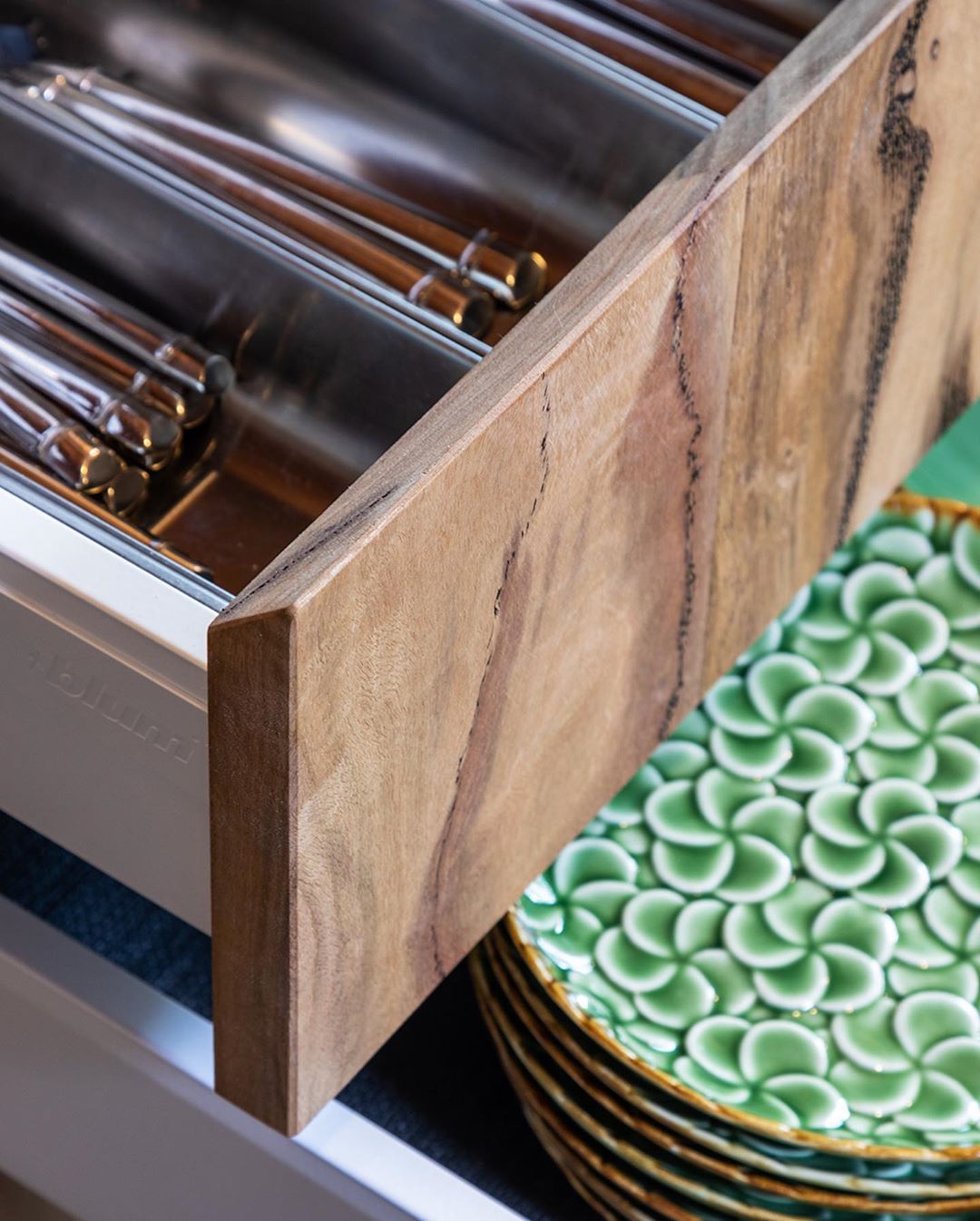 Tailor storage space to your needs and organise Blum TANDEMBOX drawers to their full potential with Blum ORGA-LINE drawer inserts. Displayed here in this stylish space by Stirling Carpentry