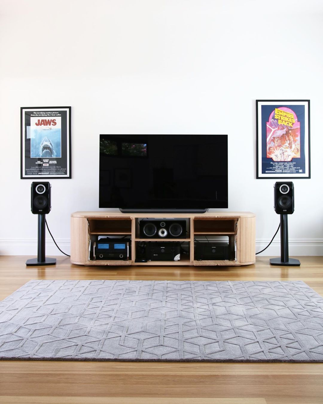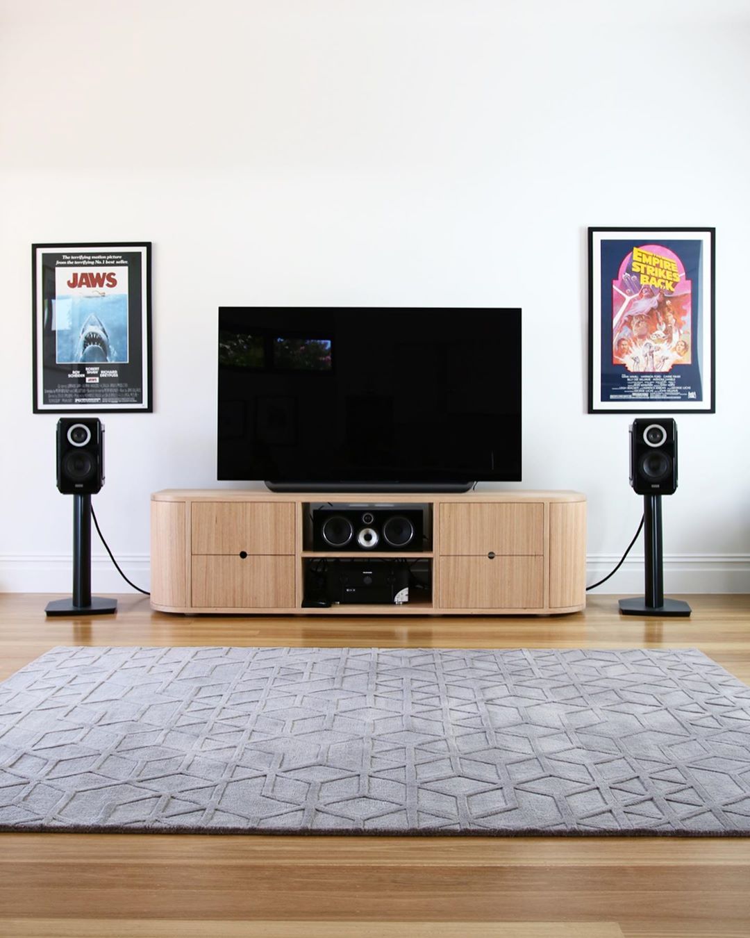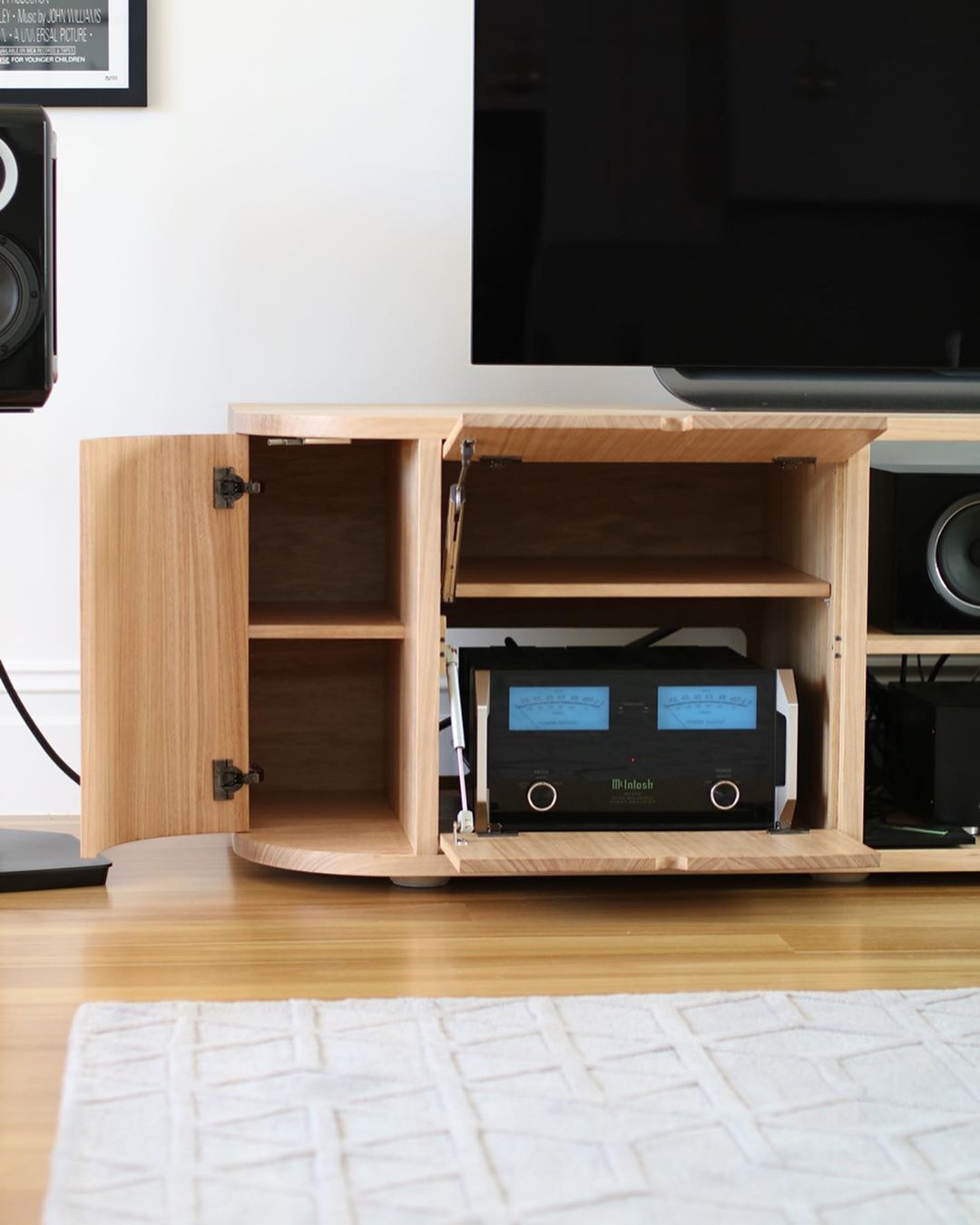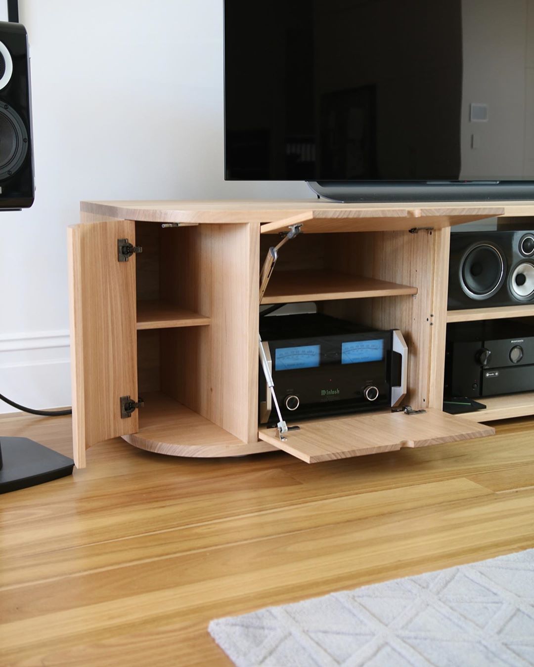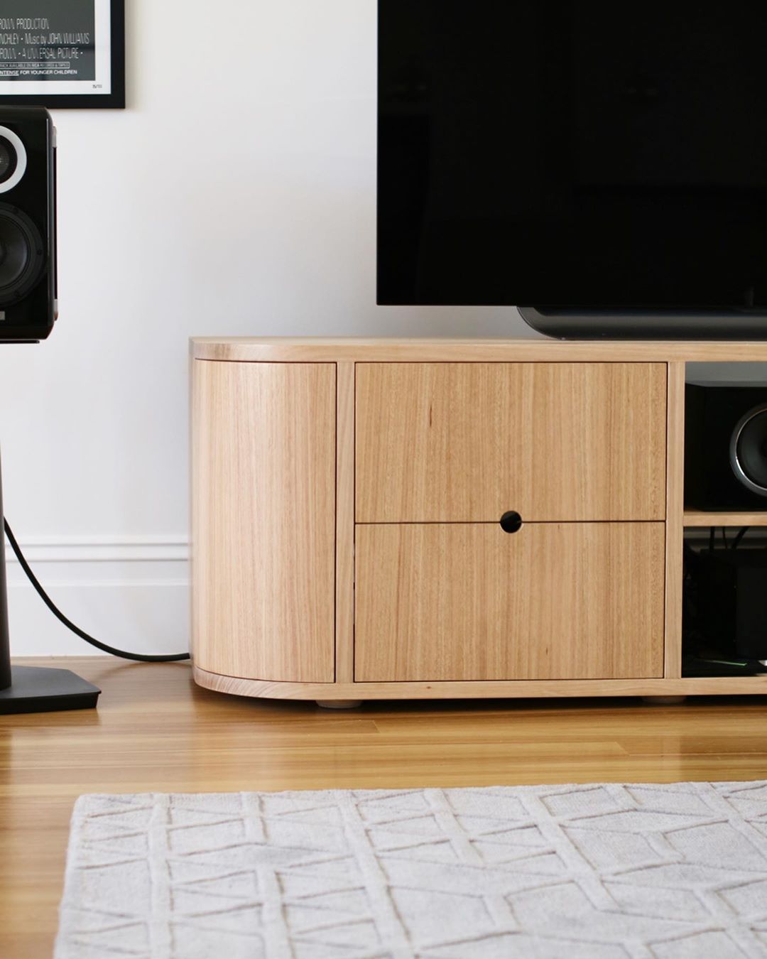 We're all about this curved TV unit. Natural timber complimented with dark hinges.